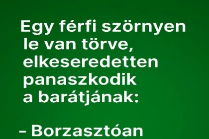 Egy férfi szörnyen le van törve, elkeseredetten panaszkodik a barátjának: – Borzasztóan…