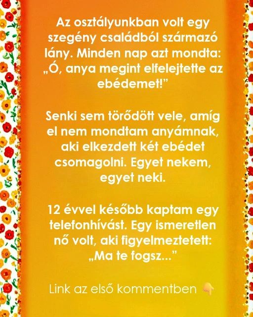 Tizenkét évvel később ismeretlen szám villant fel a kijelzőmön. Felvettem, egy meleg, ismerős hang mondta ki a nevem. Ő volt az. Elmondta, hogy keresett egy ideje, nem valami nagy dolog miatt, csak hogy megköszönje. Ahogy beszélt, összeszorult a mellkasom. Azt mondta, akkoriban a családja csendben küzdött. Azok az ebédek nem csupán ételek voltak, hanem annak a jelei, hogy valaki észrevette. Hogy fontos. Hogy nem láthatatlan.