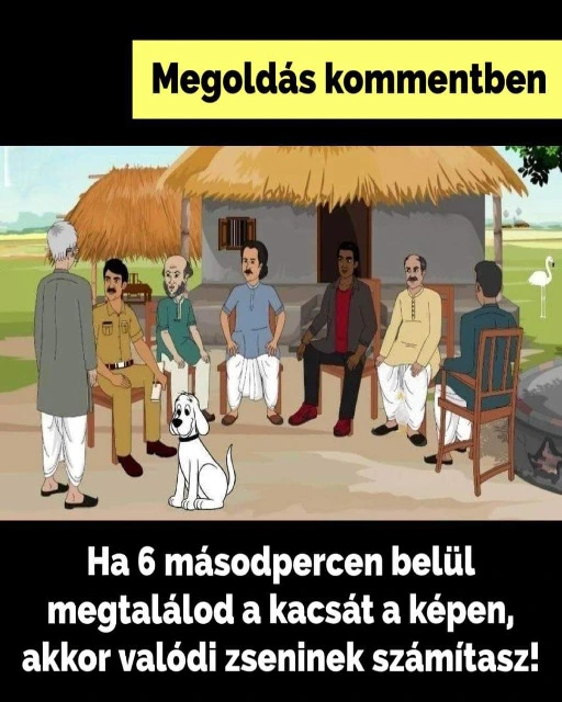A képen beszélgető embereket és egy előtérben lévő kutyát láthatunk, így első pillantásra teljesen hétköznapi lehet. Azonban a készítő elrejtett még egy állatot a rajzon, valahol ott van egy kacsa. Ezt kell felkutatnod, és csupán 6 másodperced van rá. Nézd meg gondosan a képet! A megoldást a cikkben lejjebb találod.