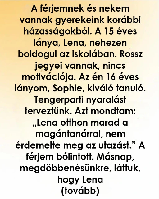 Amikor megterveztük a családi tengerparti nyaralást, kimondtam, amit gondoltam: Lena maradjon otthon, tanuljon a korrepetitorokkal, mert nem érdemelte meg az utat. A férjem kelletlenül bólintott, nem örült, de nem vitatkozott.